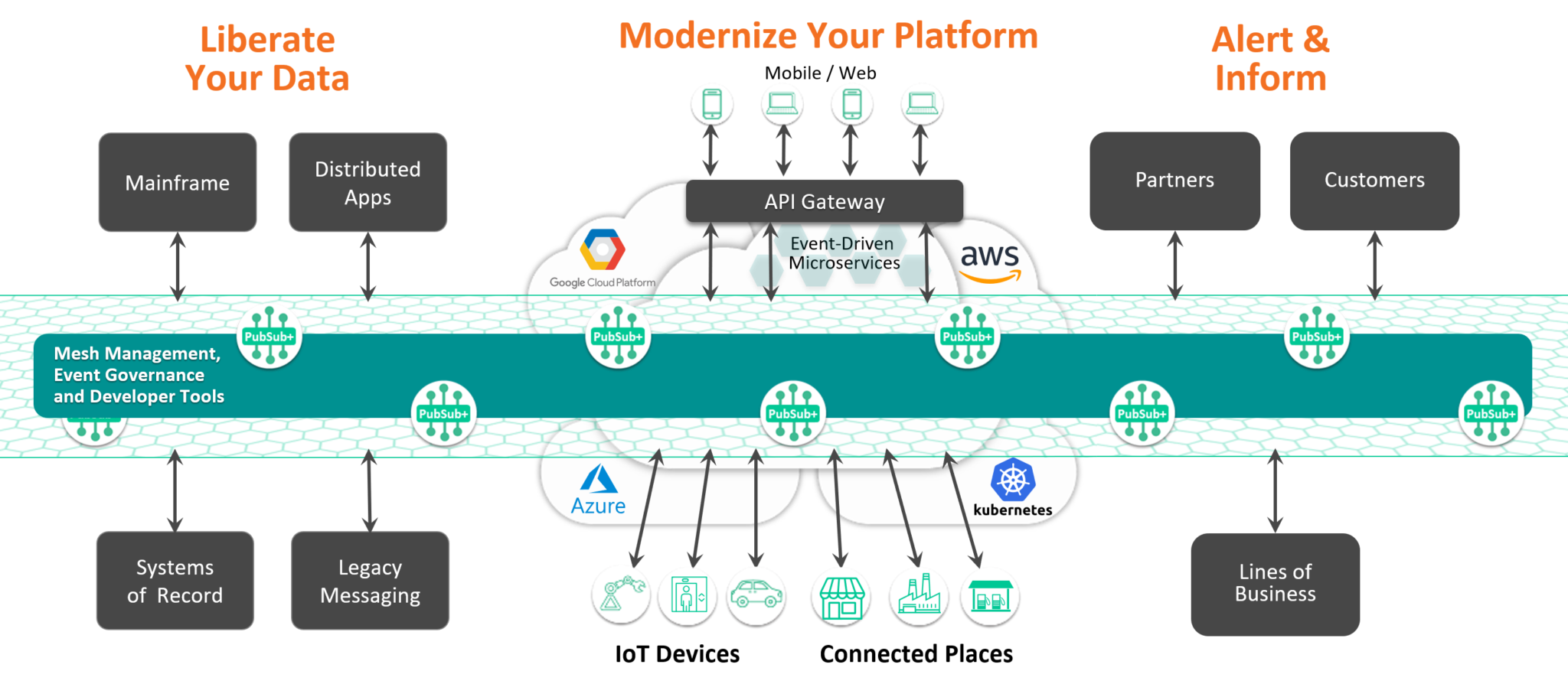- Enhance agility and accelerate innovation by democratizing access to real-time data, making it easy to build, change, and add to the way applications and devices interact, and incorporating new apps, cloud services, IoT devices, AI, and future capabilities into existing business processes in a robust and scalable manner, thereby future-proofing your architecture. Changes at the edges have a localized impact/risk, improving agility.